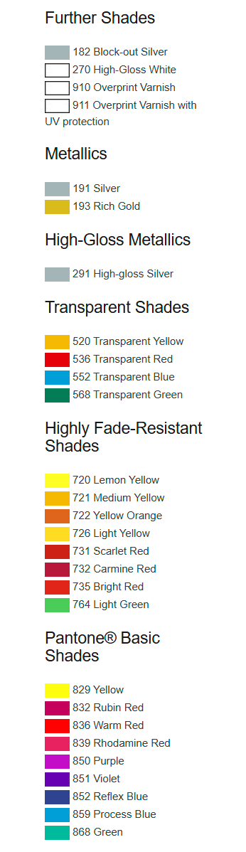 Dažai gali būti naudojami tiek kaip 1-komponentė, tiek kaip 2-komponentė (pridėjus kietiklį) sistema. Rekomenduojama spausdinimui ant įvairių medžiagų, tarp jų: Kietasis PVC, PVC lipnios plėvelės. ABS, SAN plastikai. Akrilas (PMMA), polikarbonatas (PC). Anoduotas aliuminis, lakūnuoti paviršiai – su tinkamu paruošimu.