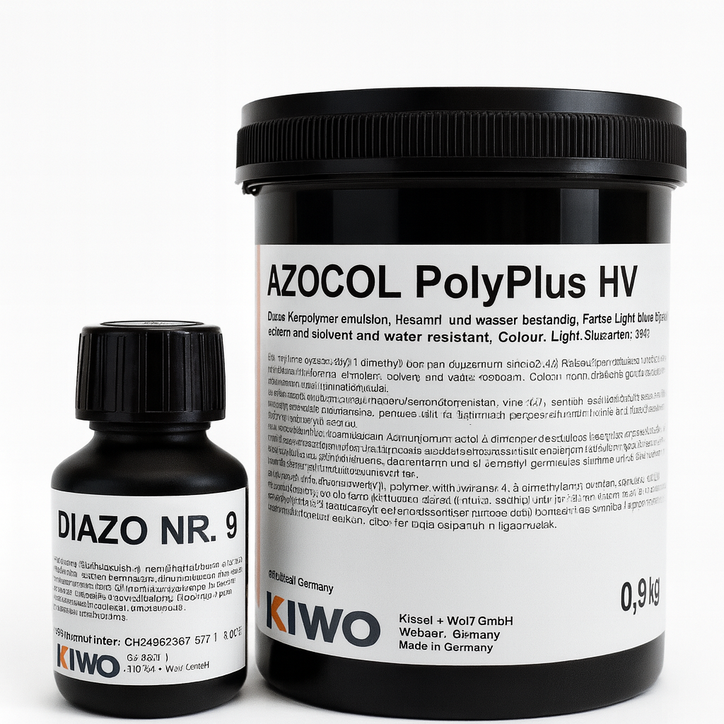 Dviejų komponentų šilkografijos emulsija su diazu Nr. 9 – atspari tirpikliams ir vandeniui, tinka smulkiam rasteriui. 0,9 kg.
