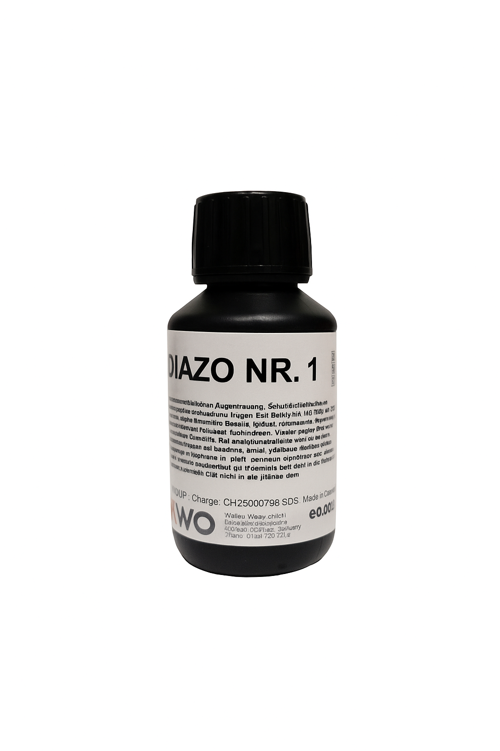 Diazo Nr. 1 yra skirtas fotopolimerinėms emulsijoms (diazo-UV arba dual-cure tipui), kurios naudojamos šablonų gamyboje sitodrukui. Jis leidžia emulsijai „sujautrėti“ (sensitize) prieš eksponavimą UV šviesa, užtikrinant tinkamą sluoksnio standumą ir galimybę išplauti spaudžiamą vietą po ekspozicijos. (šaltinis: kiwo.com)Jautiklį reikia ištirpinti šiltame (~ 40 °C) distiliuotame vandenyje, kad būtų išvengta metalų jonų ar kitų priemaišų poveikio emulsijos kokybei.Ištirpintą Diazo Nr. 1 reikia pilti į emulsiją ir kruopščiai sumaišyti, po to leisti emulsijai „išleisti burbuliukus“ (~2 val), kad padengtų tolygiai ir nesusidarytų defektai.Laikymas: emulsija sužautinta jautikliu turi būti saugoma vėsioje, tamsioje patalpoje (~20 °C), kad neprarastų savybių.Pritaikymas: tinka tiek vandens, tiek tirpiklių pagrindo spaudai – kai naudojama kartu su atitinkama emulsija.