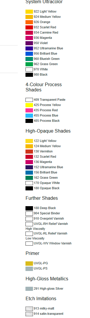 Ultra Glass UVGL yra dvikomponentė, UV-kietėjanti (UV-curable) ekrano spaudos rašalų sistema, skirta dekoravimui ant stiklo, metalo, padengtų paviršių bei kitų sudėtingų substratų. Greitas kietėjimas UV spinduliais — nereikalauja papildomo džiovinimo po spausdinimo. Blizgus paviršius („glossy finish“) su vidutiniu padengiamumu („medium opacity“) — tinka dekoratyviam naudojimui. Aukštas atsparumas: įbrėžimams, chemikalams (šarmams, rūgštims), indaplovėms — todėl tinkamas naudojimui ant restoraninių ar indams skirtų stiklų. Suderinamas su įvairiais substratais: stiklas, keramika, metalas, anoduotas aliuminis, padengti paviršiai. Formulė be kritinių sunkiųjų metalų (pvz., švinas ar kadmis) — atitinka šiuolaikinius aplinkosaugos reikalavimus.